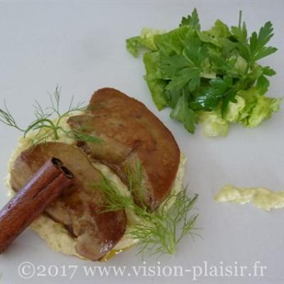 Poêler les escalopes de foie gras. Ne pas oublier de les passer dans la farine et en ôtant au maximum l’excédent de farine. Les cuire dans une poêle bien chaude et sans matière grasse. Les laisser cuire 2 à 3 minutes par face sur feu moyen. Une fois terminée la cuisson du foie gras, les disposer sur un papier absorbant pour éliminer la graisse du canard.