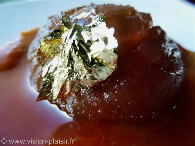 Disposer vos pots dans le plat. Allumer votre four à 140° C. Dans un saladier ajouter les œufs entiers et les jaunes d’œufs. Y verser la crème de marron et fouetter pour blanchir l’ensemble. Verser le lait chaud sur les œufs blanchis. Il faut que le lait soit à une température de 40° C maxi. Mélanger au fouet sans trop fouetter. Passer votre préparation à la passette. Verser dans un pichet votre préparation et remplir les ramequins. Disposer votre plat à l’entrée du four et rempli d’un peu d’eau chaude. Il faut mettre 1 à 2 cm d’eau. Pousser doucement votre plat dans le milieu du four. Recouvrir une grille de four de papier de cuisson ou de papier aluminium. Retourner votre grille à l'envers et la disposer sur les crèmes caramel. Cuire pendant 1 h 15 à 1 h 30. Le fait de mettre un papier sur les crèmes au caramel évite la formation d’une croûte qui serait désagréable à la dégustation. Pour bien comprendre la procédure, je vous invite à regarder la vidéo. Au bout du temps de cuisson, vérifier la cuisson en piquant légèrement une crème au caramel à l’aide d’un couteau à lame fine. Puis déposer cette lame sur la paume de votre poignet. Elle doit être chaude. Attention tout de même à ne pas vous brûler. Ôter les ramequins du bain-marie et les laisser refroidir 24 heures au réfrigérateur. Pour les démouler, passer une lame d’un couteau à lame très fine tout autour des ramequins. Retourner une assiette sur le ramequin et retourner le tout. Ôter doucement le ramequin de la crème au caramel. Laisser couler le caramel autour de la crème caramel et ajouter un marron glacé sur le dessus. Un petit paillette d’or alimentaire fera son effet de fête.
