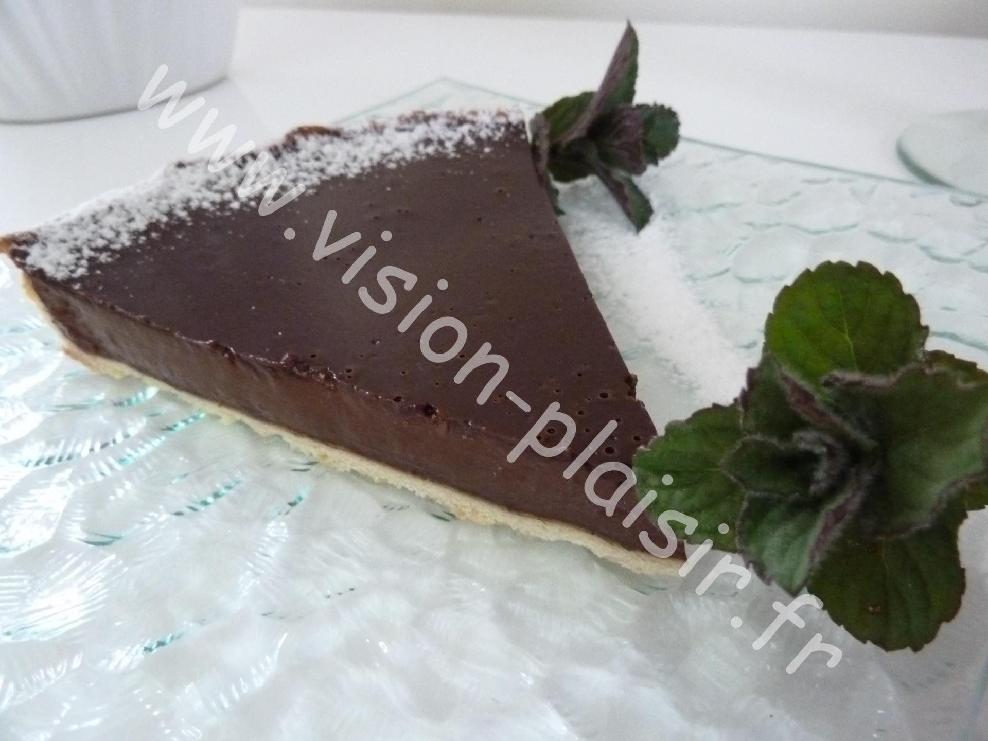 La tarte chocolat version Vision-plaisir est une tarte avec beaucoup de chocolat et peu sucrée. Réservé au amateur.