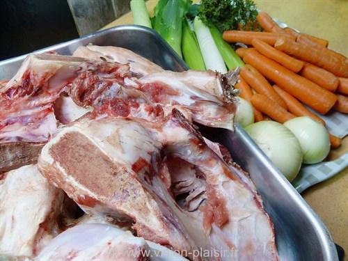 Mijotage : Les os sont ensuite placés dans une grande marmite avec des légumes (carottes, oignons, céleri) et des herbes aromatiques (thym, laurier, persil). Le mélange est couvert d'eau froide et mijoté lentement pendant plusieurs heures.